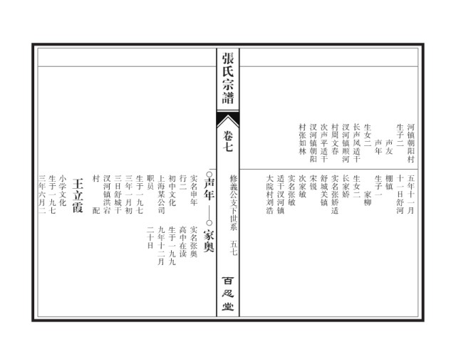 张氏宗谱 村张如林 汊河镇朝阳 次声平适干 村周文春 汊河镇顺河 长声凤适干 生女二 生子二 河镇朝阳村 卷七 声年 声友 三年六月二 生于一九七 小学文化 王立霞 村 汊河镇洪宕 三日舒城干 三年一月初 生于一九七 职员 上海某公司 初中文化 行二 实名申年 声年 修義公支下世系 大院村刘浩 适干汊河镇 实名张敏 宋锐 舒城关镇 实名张娇适 长家娇 生女二 生子一 棚镇 十一日舒河 五年十一月 次家敏 家柳 配 二十日 九年十二月 生于一九九 高中在读 实名张奥 家奥 五七 百忍堂