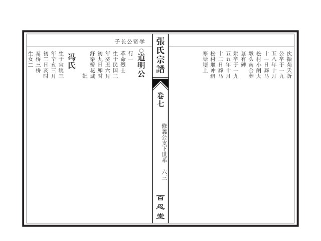 张氏宗谱 子长公贤学 生女二 秦桥三桥 初三日亥时 年辛亥三月 生于宣统三 冯氏 舒秦桥花城 初九日卯时 年癸丑六月 生于民国二 革命烈士 行一 道明公 寒塘埂上 松村堰冲组 十二日葬马 五五年十月 妣卒于一九 墓有碑 墩头南合葬 松村小闸大 十一日葬马 五八年十月 公卒于一九 次振菊夭折 妣 卷七 修義公支下世系 六三 百忍堂