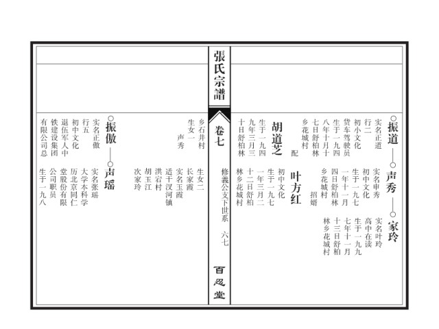 生于一九八 公司职员 堂股份有限 历北京同仁 大学本科学 实名张瑶 声瑶 次家玲 胡玉江 洪宕村 适干汊河镇 实名玉霞 长家霞 生女二 修義公支下世系 林乡花城村 十二日舒柏 一年三月二 生于一九七 初中文化 叶方红 乡花城村 四日舒柏林 一年十一月 生于一九七 初中文化 实名申秀 声秀