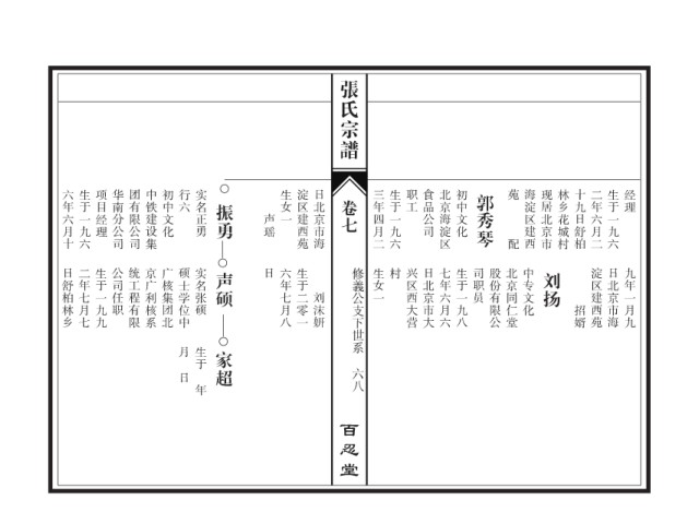 日舒柏林乡 二年七月七 生于一九九 公司任职 统工程有限 京广利核系 广核集团北 硕士学位中 实名张硕 声硕 日 六年七月八 生于二零一 修義公支下世系 生女一 村 兴区西大营 日北京市大 七年六月六 生于一九八 司职员 股份有限公 北京同仁堂 中专文化 刘扬 淀区建西苑 日北京市海 九年一月九