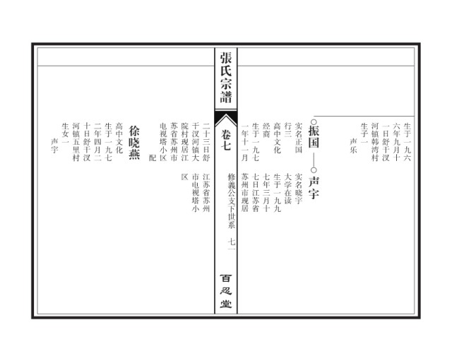 张氏宗谱 生女一 河镇五里村 十日舒干汊 二年四月二 生于一九七 高中文化 徐晓燕 电视塔小区 苏省苏州市 院村现居江 干汊河镇大 二十三日舒 一年十一月 生于一九七 经商 高中文化 行三 实名正国 振国 生子一 河镇韩湾村 一日舒干汊 六年九月十 生于一九六 卷七 声宇 声乐 配 区 市电视塔小 江苏省苏州 修義公支下世系 苏州市现居 七日江苏省 七年三月十 生于一九九 大学在读 实名晓宇 声宇 七一 百忍堂