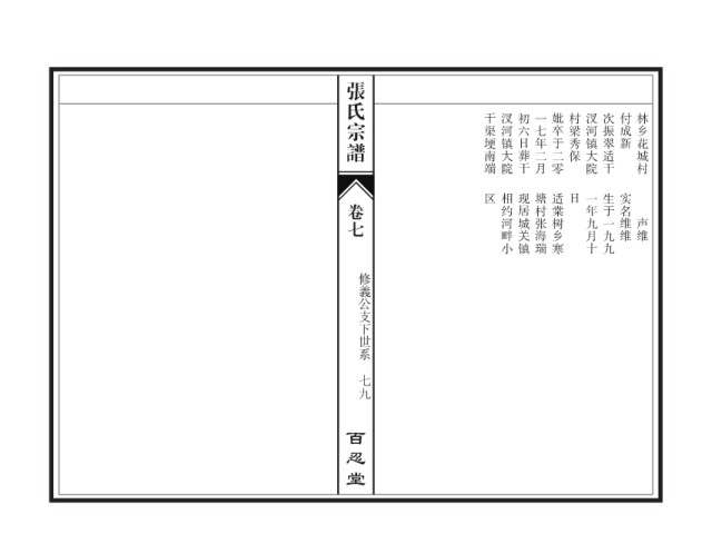 张氏宗谱 干渠埂南端 汊河镇大院 初六日葬干 一七年二月 妣卒于二零 村梁秀保 汊河镇大院 次振翠适干 付成新 林乡花城村 区 相约河畔小 现居城关镇 塘村张海瑞 适棠树乡寒 日 一年九月十 生于一九九 实名维维 卷七 声维 修義公支下世系 七九 百忍堂