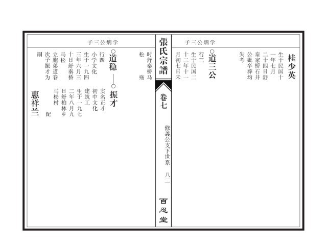 张氏宗谱 子三公炳学 子三公炳学 嗣 次子振才为 立胞弟道春 马松 十日舒秦桥 三年六月三 生于一九四 小学文化 行四 道稳 松 时舒秦桥马 月初七日未 十二年十一 生于民国二 行三 道三公 失考 公妣卒葬均 秦家桥石井 二十四日舒 一年七月 生于民国十 桂少英 殇 惠祥兰 马松村 日舒柏林乡 二年八月九 生于一九七 建筑工 初中文化 实名正才 振才 卷七 配 修義公支下世系 八二 百忍堂