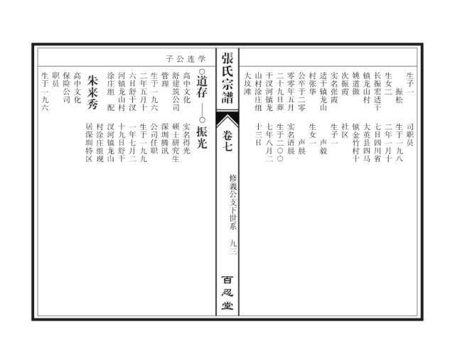 生于一九六 职员 保险公司 高中文化 朱来秀 涂庄组 河镇龙山村 六日舒干汊 二年五月十 生于一九六 管理 舒建筑公司 高中文化 道存 大坟滩 山村涂庄组 干汊河镇龙 二十九日葬 零零年五月 公卒于二零 村张华 适干镇龙山 实名张霞 次振霞 姚道傲 镇龙山村 长振宏适干 生女二 生子一