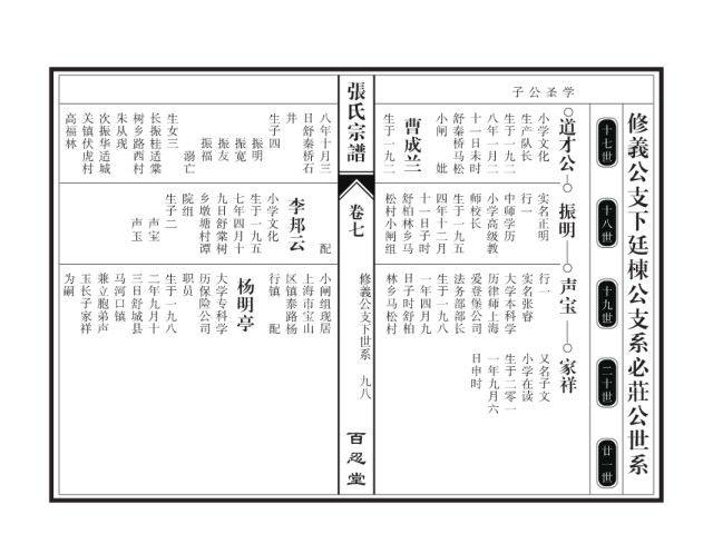 为嗣 玉长子家祥 兼立胞弟声 马河口镇 三日舒城县 二年九月十 生于一九八 职员 历保险公司 大学专科学 杨明亭 行镇 区镇泰路杨 上海市宝山 小闸组现居 修義公支下世系 林乡马松村 日子时舒柏 一年四月九 生于一九八 法务部部长 爱登堡公司 历律师上海 大学本科学 实名张睿 行一 声宝
