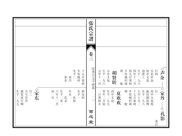 张氏宗谱 卷三 廷秀公支下世系 生子二 乡窑墩村 十五日棠树 五年十一月 生于一九六 小学文化 胡贤转 树 乡窑墩村柿 初九日棠树 四年十二月 生于一九六 油漆工 初中文化 实名申余 行四 声余 家丹 家东 配 生于一九九 服装设计师 大专学历 行二 家东 初一日 六年十二月 生于二零一 生女一 生子一 新安村 一日棠树乡 零年二月初 生于一九九 高中文化 夏欢欢 树 乡窑墩村柿 十七日棠树 七年十月二 生于一九八 脑印刷技师 高中文化电 行一 家丹 孔苿 一三 孔影 配 百忍堂 孔影 系后