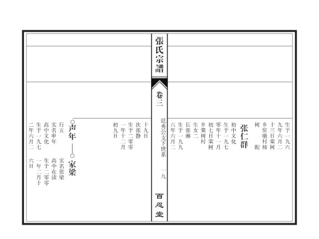 张氏宗谱 卷三 廷秀公支下世系 二年六月二 生于一九七 高中文化 实名申年 行五 声年 初九日 一年十二月 生于二零零 次张静 十九日 六年六月二 生于一九九 长张琳 生女二 乡棠树村 初七日棠树 零年十一月 生于一九七 初中文化 张仁群 树 乡窑墩村柿 十三日棠树 九年六月二 生于一九六 配 六日 一年二月十 生于二零零 高中在读 实名张梁 家梁 一九 百忍堂