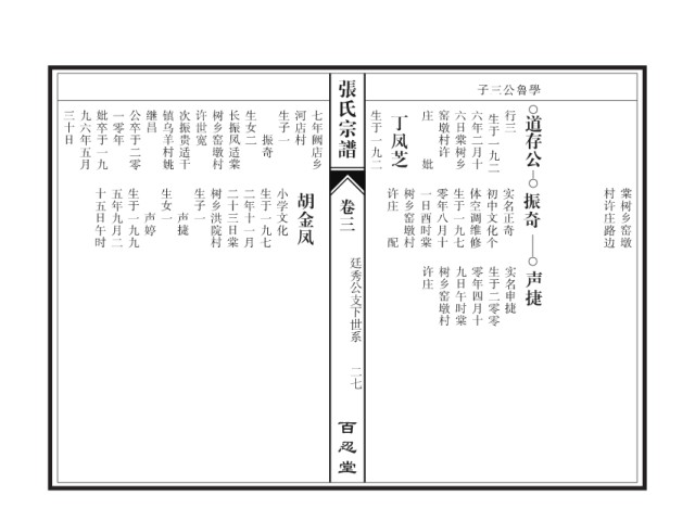 三十日 九六年五月 妣卒于一九 一零年 公卒于二零 继昌 镇乌羊村姚 次振贵适干 许世宽 树乡窑墩村 长振凤适棠 生女二 生子一 河店村 七年阙店乡 生于一九二 丁凤芝 庄 窑墩村许 六日棠树乡 六年二月十 生于一九二 行三 道存公