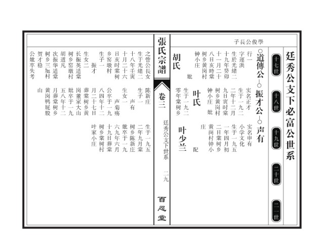 公妣卒失考 贺才稳 树乡三 次振华适棠 胡道凡 树乡窑墩村 长振英适棠 生女二 生子一 乡窑墩村 日亥时棠树 十月二十六 十八年壬寅 生于光绪二 之管公長女 胡氏 钟小庄 树乡黄岗村 八日亥時棠 十一月二十 十九 生於光緒二 字運洪 行一 道傳公 廷秀公支下必富公世系