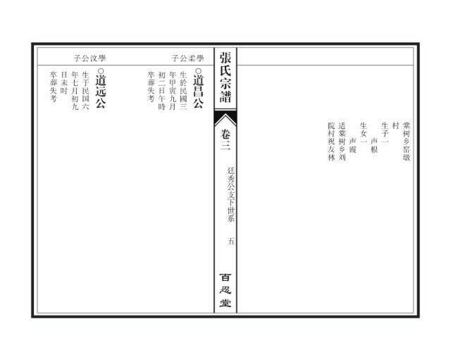 张氏宗谱 子公汶學 子公柔學 卒葬失考 日未时 年七月初九 生于民国六 道远公 卒葬失考 初二日午時 年甲寅九月 生於民國三 道昌公 院村祝友林 适棠树乡刘 生女一 生子一 村 棠树乡窑墩 卷三 声霞 声根 廷秀公支下世系 五 百忍堂