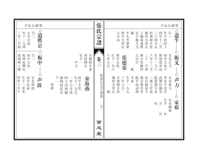二年二月初 生于一九四 小学文化 行二 道胜公 大公山 树乡大官庄 卒失考葬棠 嗣 长子振义为 立胞弟道胜 墩村大官庄 时棠树乡窑 二十四日亥 四年十二月 生于民国十 行一 道牛