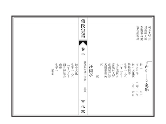 张氏宗谱 婆合茔有碑 东南坡与婆 对面韩大山 树乡大官庄 卷三 廷秀公支下世系 生子一 尚桥 四日怀远县 二年八月十 生于一九八 初中文化 汪树亭 区 无锡市新吴 庄现居江苏 窑墩村大官 七日棠树乡 一年二月十 生于一九八 绣培训师 初中文化纹 实名申斗 行二 声斗 家乐 配 七月十六日 二零一二年 家乐 五八 生 于 百忍堂