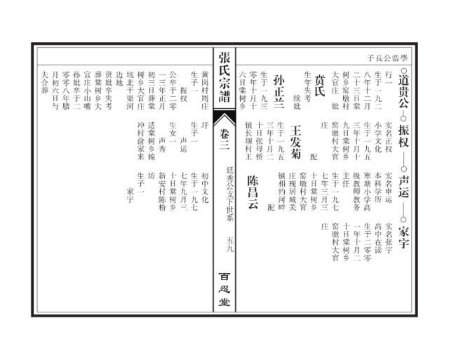 夫合葬 月初六日与 零零八年腊 孙妣卒于二 官庄小山嘴 葬棠树乡大 贲妣卒失考 边地 坑北干渠河 树乡大官庄 初三日葬棠 一三年正月 公卒于二零 生子一 黄岗村周庄 六日棠树乡 零年十月十 生于一九三 孙正兰 生年失考 贲氏 大官庄 树乡窑墩村 二十三日棠 八年十二月 生于一九二 行一 道贵公