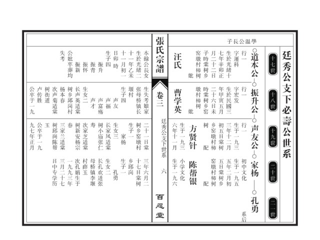 失考 公妣卒葬均 生子四 日卯 十一月初一 十一年乙未 生於光緒二 本餘公長女 汪氏 窑墩村柿树 子時棠树乡 月二十二日 七年辛卯正 生於光緒十 字運科 行一 道本公 廷秀公支下必壽公世系