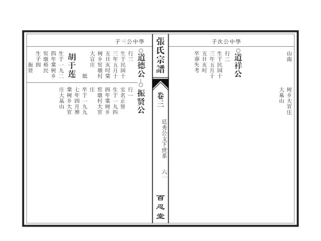 张氏宗谱 子三公中學 子次公中學 生子四 窑墩裕民 四年棠树乡 生于一九二 胡于莲 大官庄 树乡窑墩村 五日亥时棠 三年五月十 生于民国十 行三 道德公 卒葬失考 五日亥时 三年五月十 生于民国十 行二 道祥公 山南 振贤 妣 庄大墓山 棠树乡大官 七年四月葬 卒于一九九 庄 窑墩村大官 四年棠树乡 生于一九四 实名正贤 行一 振贤公 大墓山 树乡大官庄 卷三 廷秀公支下世系 六一 百忍堂