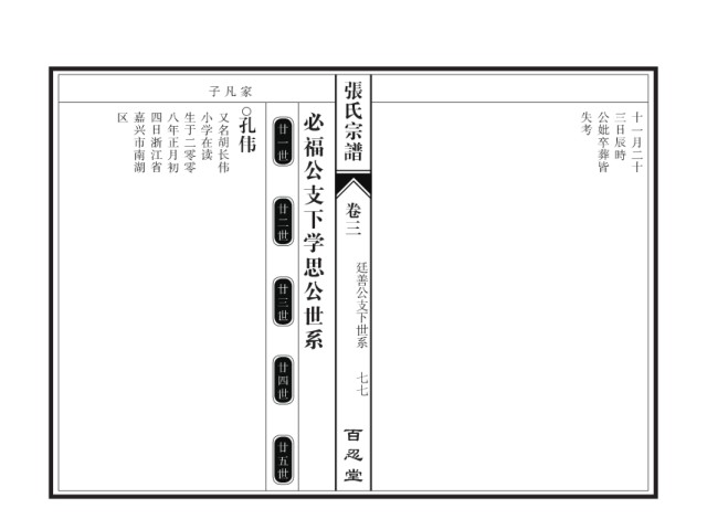 张氏宗谱 子凡家 区 嘉兴市南湖 四日浙江省 八年正月初 生于二零零 小学在读 又名胡长伟 孔伟 必福公支下学思公世系 失考 公妣卒葬皆 三日辰時 十一月二十 廿一世 廿二世 卷三 廷善公支下世系 廿三世 廿四世 七七 百忍堂 廿五世