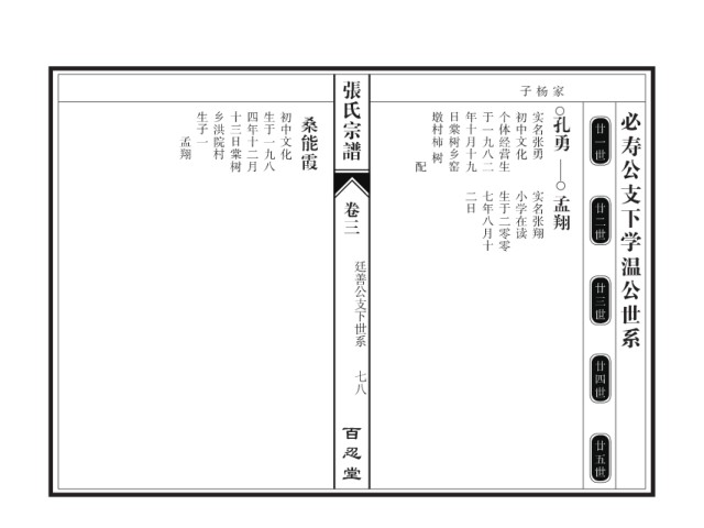 张氏宗谱 子杨 家 生子一 乡洪院村 十三日棠树 四年十二月 生于一九八 初中文化 桑能霞 墩村柿 日棠树乡窑 年十月十九 于一九八二 个体经营生 初中文化 实名张勇 孔勇 必寿公支下学温公世系 廿一世 孟翔 树 配 二日 七年八月十 生于二零零 小学在读 实名张翔 孟翔 卷三 廿二世 廷善公支下世系 廿三世 廿四世 七八 百忍堂 廿五世