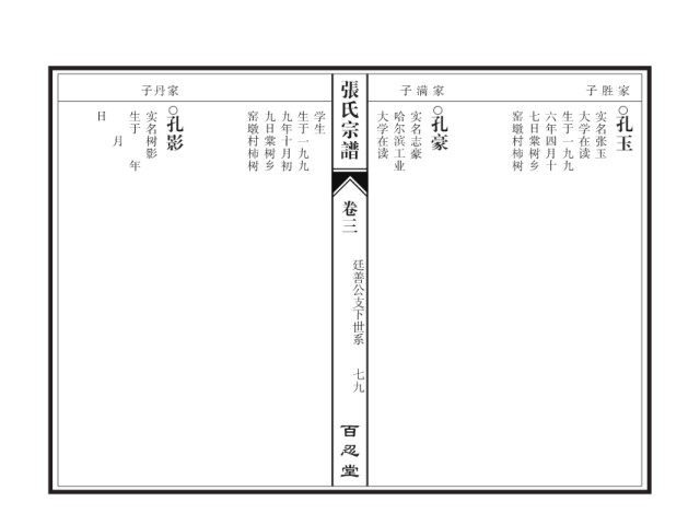 张氏宗谱 子丹家 子满 家 子胜 家 日 生于 实名树影 孔影 窑墩村柿树 九日棠树乡 九年十月初 生于一九九 学生 大学在读 哈尔滨工业 实名志豪 孔豪 窑墩村柿树 七日棠树乡 六年四月十 生于一九九 大学在读 实名张玉 孔玉 月 年 卷三 廷善公支下世系 七九 百忍堂
