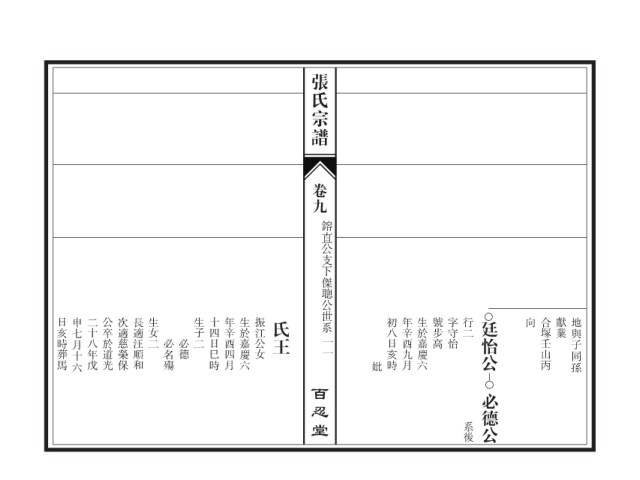 张氏宗谱 卷九 鎔直公支下傑聰公世系 日亥時葬馬 申七月十六 二十八年戊 公卒於道光 次適慈榮保 長適汪順和 生女二 生子二 十四日巳時 年辛酉四月 生於嘉慶六 振江公女 氏王 初八日亥時 年辛酉九月 生於嘉慶六 號步高 字守怡 行二 廷怡公 向 合塚壬山丙 獻業 地與子同孫 必名殤 一一 必德 妣 百忍堂 必德公 系後