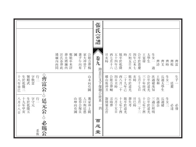 十八年癸巳 生於乾隆三 號殿武 字斆富 行二 齊富公 山未向有圖 蝶山後冲丑 公妣合葬蝴 四日丑時 酉八月二十 二十九年己 妣卒於道光 亥時 七月十七日 三十年庚戌 公卒於道光 次適褚茂知 王復和 長適太學生 生女二 生子一