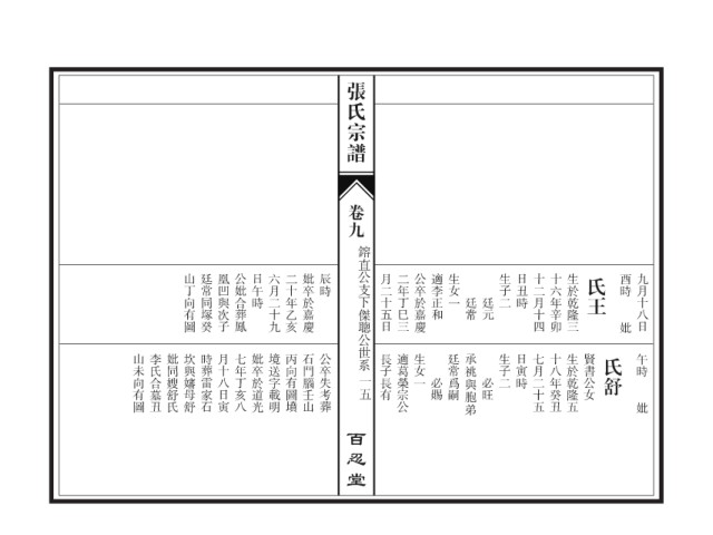 山未向有圖 李氏合墓丑 妣同嫂舒氏 坎與嬸母舒 時葬雷家石 月十八日寅 七年丁亥八 妣卒於道光 境送字載明 丙向有圖墳 石門腦壬山 公卒失考葬 長子長有 適葛榮宗公 生女一 廷常爲嗣 承祧與胞弟 生子二 日寅時 七月二十五 十八年癸丑 生於乾隆五 賢書公女 氏舒 午時