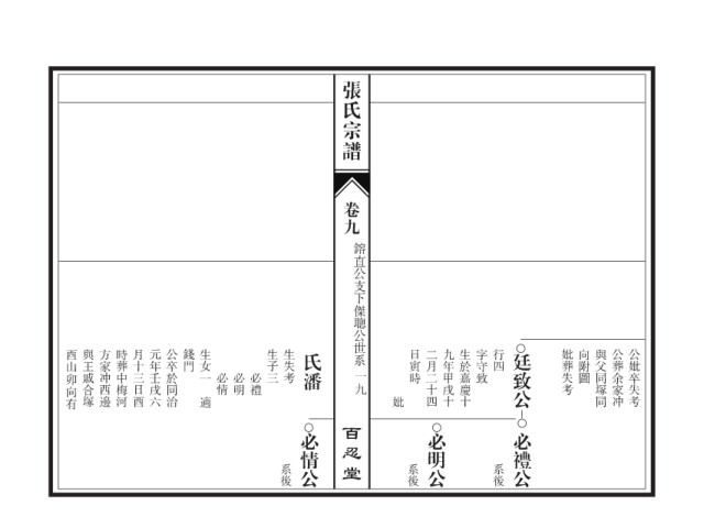 张氏宗谱 卷九 鎔直公支下傑聰公世系 酉山卯向有 與王戚合塚 方家冲西邊 時葬中梅河 月十三日酉 元年壬戌六 公卒於同治 錢門 生女一 生子三 生失考 氏潘 日寅時 二月二十四 九年甲戌十 生於嘉慶十 字守致 行四 廷致公 妣葬失考 向附圖 與父同塚同 公葬余家冲 公妣卒失考 必禮 必明 必情 一九 適 妣 百忍堂 必情公 必明公 必禮公 系後 系後 系後