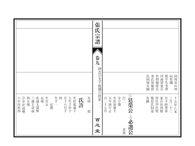 张氏宗谱 卷九 鎔直公支下傑聰公世系 氏同塚有圖 李氏姪媳舒 坎與媳舒氏 河南雷家石 妣卒失考葬 向有圖 同塚艮山坤 六年丙辰四 公卒於咸豐 四五殤 三適王壽福 次適文謨舉 長殤 生女五 生子一 時 月十六日子 七年壬申十 生於嘉慶十 氏許 亥時 月二十七日 五年庚午正 生於嘉慶十 字守榮 行二 廷榮公 有圖 媳舒氏同墓 舒氏李氏姪 家石坎與媳 日子時葬雷 二月二十二 十五年乙未 必選 二一 妣 百忍堂 必選公 系後