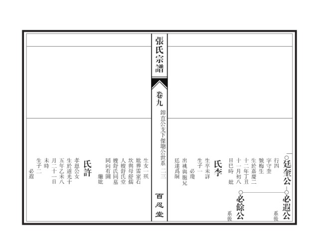 张氏宗谱 卷九 鎔直公支下傑聰公世系 生子二 未時 月二十一日 五年乙未八 生於道光十 孝恩公女 氏許 同向有圖 嫂舒氏同墓 人嫂舒氏堂 坎與母舒孺 妣葬雷家石 生女一殀 廷達爲嗣 出祧與胞兄 生子一 生卒未詳 氏李 日巳時 十一月初八 十二年丁丑 生於嘉慶二 號梅生 字守奎 行四 廷奎公 必瓊 必遐 二三 繼妣 妣 百忍堂 必餘公 必遐公 系後 系後