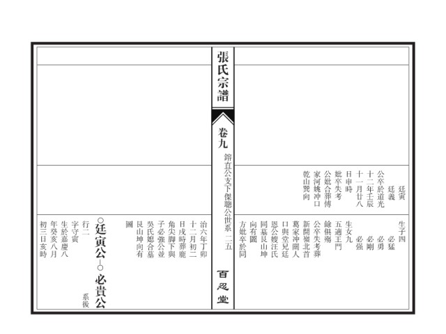 张氏宗谱 卷九 鎔直公支下傑聰公世系 乾山巽向 家河姚冲口 公妣合葬傅 妣卒失考 日申時 十一月廿八 十二年壬辰 公卒於道光 廷寅 廷義 初三日亥時 年癸亥八月 生於嘉慶八 字守寅 行二 廷寅公 圖 艮山坤向有 吳氏媳合墓 子必強公並 角尖脚下與 日戌時葬鹿 十二月初二 治六年丁卯 方妣卒於同 向有圖 同墓艮山坤 恩公嫂汪氏 口與堂兄廷 葛家冲關人 新開嶺北首 公卒失考葬 餘俱殤 五適王門 生女九 生子四 二五 必勇 必猛 必剛 必强 百忍堂 必貴公 系後