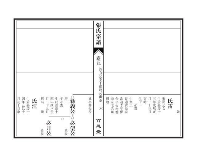 张氏宗谱 卷九 鎔直公支下傑聰公世系 月初十日申 四年己巳十 生於嘉慶十 氏汪 巳時 月二十九日 四年己巳正 生於嘉慶十 字守義 行三 廷義公 妣卒葬失考 形地 李家宅老龜 公卒失考葬 次適李年保 長適黄鼎春 生女二 生子一 寅時 月二十三日 三年戊辰正 生於嘉慶十 聚周公女 氏雷 二六 必貴 妣 妣 百忍堂 必月公 必望公 系後 系後