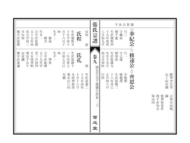 妣卒於嘉慶 向有圖 塘窪子山午 日亥時葬柯 寅三月初四 五十九年甲 公卒於乾隆 生子一 時 月初七日巳 一年丙寅七 生於乾隆十 氏孔 初五日卯時 年甲子五月 生於乾隆九 號如珍 字志遠 行一 修遠公