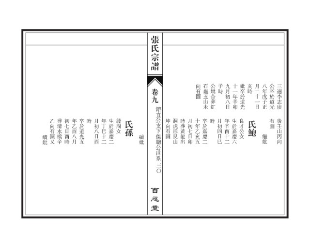 张氏宗谱 向有圖 石龜丑山未 公妣合葬紅 子時 九月初八日 十一年辛卯 妣卒於道光 亥時 月二十一日 八年戊子正 公卒於道光 三適李志廣 卷九 鎔直公支下傑聰公世系 乙向有圖又 葬清水橋辛 初七日酉時 年乙酉八月 卒於道光五 時 月初八日酉 年丁巳十二 生於嘉慶二 錢周女 氏孫 坤向有圖 洞虎形艮山 時葬黃龍出 月初七日卯 十年乙亥五 卒於嘉慶二 時 月初四日巳 年辛酉十二 生於嘉慶六 良才公女 氏鮑 有圖 後壬山丙向 繼妣 續妣 續妣 三〇 百忍堂