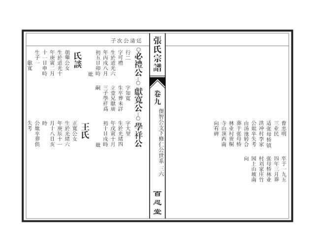 失考 公妣卒葬俱 時 月十八日亥 年庚辰十一 生於光緒六 正寬公女 王氏 初十日戌時 年戊寅十月 生於光緒四 字大堃 學祥公 向有碑 寺山顶西南 林业村贵桐 葬于张母桥 由汤池转合 公妣卒失考 洪冲村李家 适张母桥镇 三业民 曹忠明