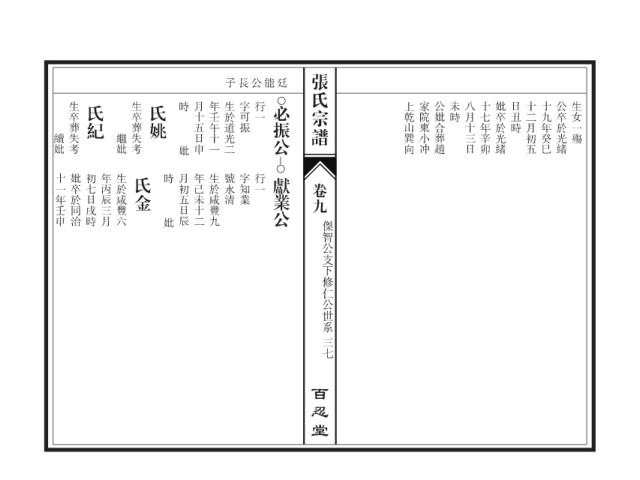 张氏宗谱 子長公能廷 生卒葬失考 氏紀 生卒葬失考 氏姚 時 月十五日申 年壬午十一 生於道光二 字可振 行一 必振公 上乾山巽向 家院東小冲 公妣合葬趙 未時 八月十三日 十七年辛卯 妣卒於光緒 日丑時 十二月初五 十九年癸巳 公卒於光緒 生女一殤 繼妣 續妣 妣 十一年壬申 妣卒於同治 初七日戌時 年丙辰三月 生於咸豐六 氏金 時 月初五日辰 年己未十二 生於咸豐九 號永清 字知業 行一 獻業公 卷九 妣 傑智公支下修仁公世系 三七 百忍堂