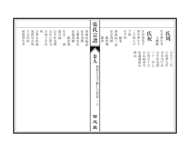 张氏宗谱 祝妣葬失考 壬山丙向 地與母合塚 公葬犬形義 時 月初十日辰 五年己卯九 公卒於光緒 葉昌福 生女一 必盛爲嗣 又兼祧堂兄 必章爲嗣 兼祧與胞弟 必雲爲嗣 兼祧與三弟 生子四 子時 二月初八日 四年甲午十 生於道光十 氏祝 生卒葬失考 氏周 獻倉 又續妣 獻業 獻技殤 獻容殤 適 巽向 形義地乾山 日辰時葬犬 巳四月十五 三十一年乙 公卒於光緒 寺亥山巳向 午時葬九井 五月十三日 卷九 傑智公支下修仁公世系 三八 百忍堂