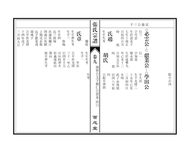 三月初九日 十四年戊子 公卒於光緒 兩祧子 長子獻業爲 立胞兄必振 四適汪良圖 次適吳繼江 長三俱殤 生女四 生子三 生卒葬失考 氏章 生卒失考 氏趙 時 月初四日丑 七年丁酉正 生於道光十 字可雲 行三 必雲公