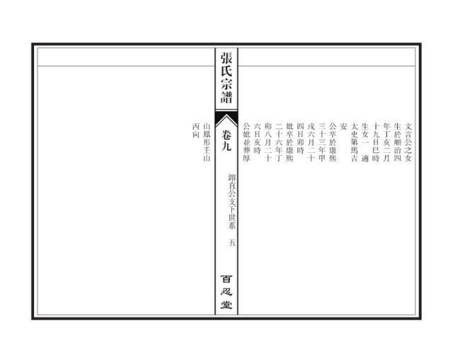 张氏宗谱 丙向 山鳳形壬山 公妣並葬厚 六日亥時 卯八月二十 二十六年丁 妣卒於康熙 四日卯時 戌六月二十 三十三年甲 公卒於康熙 安 太史第馬吉 生女一 十九日巳時 年丁亥二月 生於順治四 文言公之女 卷九 適 鎔直公支下世系 五 百忍堂