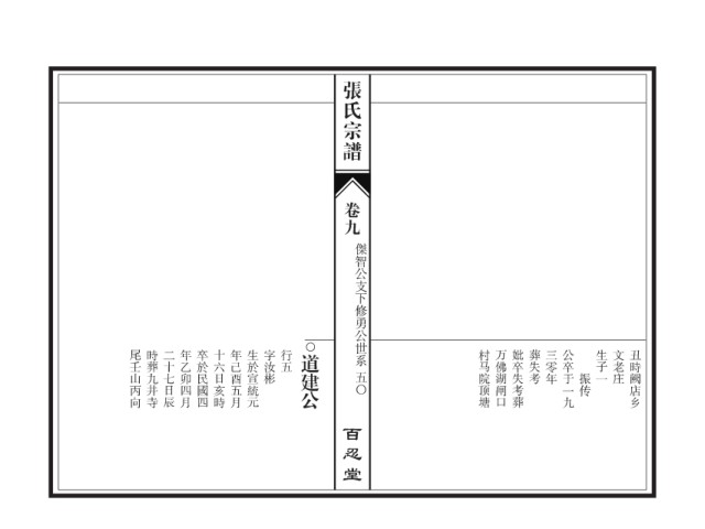 张氏宗谱 卷九 傑智公支下修勇公世系 尾壬山丙向 時葬九井寺 二十七日辰 年乙卯四月 卒於民國四 十六日亥時 年己酉五月 生於宣統元 字汝彬 行五 道建公 村马院顶塘 万佛湖闸口 妣卒失考葬 葬失考 三零年 公卒于一九 生子一 文老庄 丑時阙店乡 五〇 振传 百忍堂