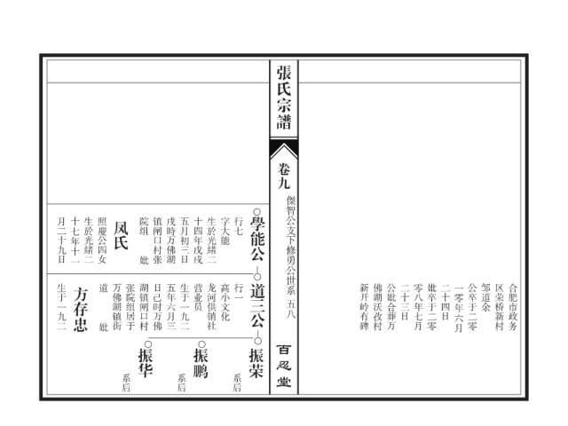 生于一九二 方存忠 道 万佛湖镇街 张院组居于 湖镇闸口村 日己时万佛 五年六月三 生于一九二 营业员 龙河供销社 高小文化 行一 道三公 新开岭有碑 佛湖沃孜村 公妣合葬万 二十三日 零八年七月 妣卒于二零 二十四日 一零年六月 公卒于二零 邹道余 区荣桥新村 合肥市政务