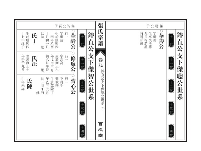 十七年戊子 生於康熙四 氏丁 巳時 十月初一日 十四年乙酉 生於康熙四 字繼 行一 華齡公 鎔直公支下傑智公世系 向同有圖 九井寺老塋 生卒失考葬 字繼善 華善公 鎔直公支下傑聰公世系
