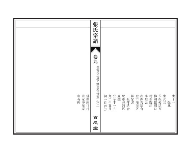张氏宗谱 卷九 傑智公支下修勇公世系 山有碑 萧家冲汪家 佛湖闸口村 初一日葬万 九二年五月 公卒于一九 夏燃 肥市包河区 三张萍适合 陈家忠 肥市瑶海区 次振秀适合 李启云 村新院组 佛湖镇闸口 长振爱适万 生女三 生子一 六二 振林 百忍堂