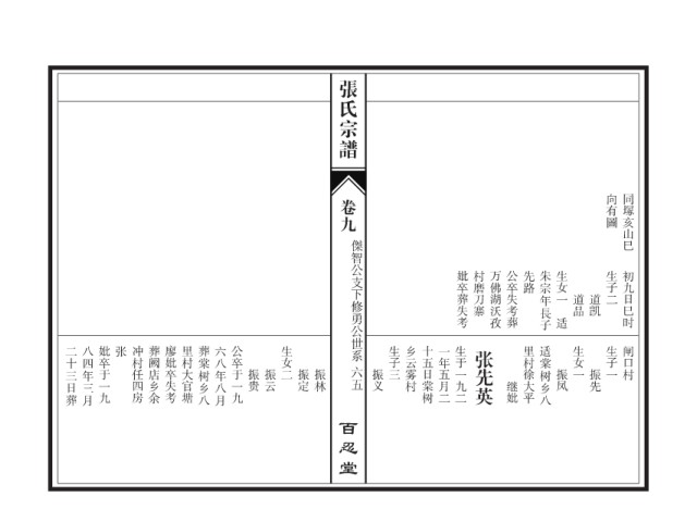 张氏宗谱 卷九 向有圖 同塚亥山巳 傑智公支下修勇公世系 妣卒葬失考 村磨刀寨 万佛湖沃孜 公卒失考葬 先路 朱宗年長子 生女一 生子二 初九日巳时 道品 道凯 适 二十三日葬 八四年三月 妣卒于一九 张 冲村任四房 葬阙店乡余 廖妣卒失考 里村大官塘 葬棠树乡八 六八年八月 公卒于一九 生女二 生子三 乡云雾村 十五日棠树 一年五月二 生于一九二 张先英 里村徐大平 适棠树乡八 生女一 生子一 闸口村 振先 振凤 振定 振贵 六五 振林 振云 振义 继妣 百忍堂