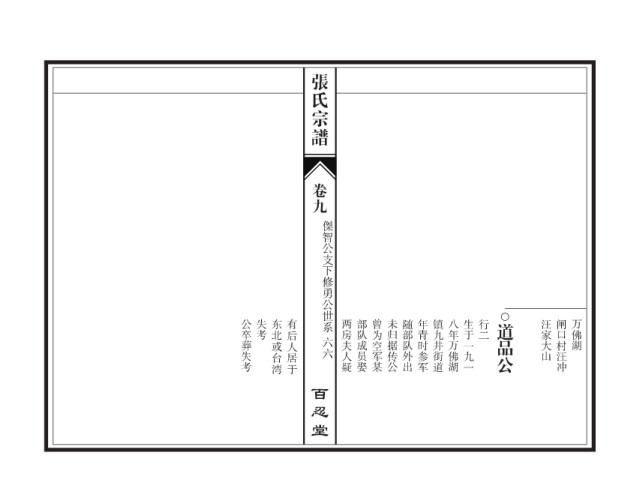 张氏宗谱 卷九 傑智公支下修勇公世系 公卒葬失考 失考 东北或台湾 有后人居于 两房夫人疑 部队成员娶 曾为空军某 未归据传公 随部队外出 年青时参军 镇九井街道 八年万佛湖 生于一九一 行二 道品公 汪家大山 闸口村汪冲 万佛湖 六六 百忍堂
