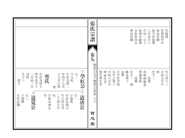 生於民國二 字瑞卿 行二 道寬公 考 公配卒葬失 时 二十四日巳 年己酉九月 生於宣統元 字盛斯 行一 道唐公