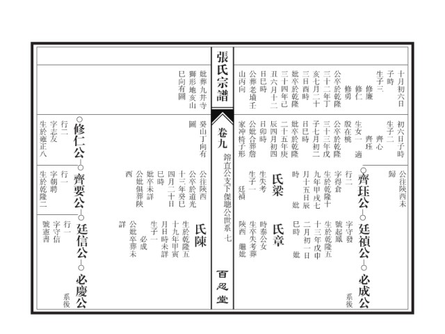 生於乾隆二 字朝聘 行一 齊要公 西 公妣俱葬陝 妣卒未詳 巳時 四月二十日 十三年癸巳 公卒於道光 公往陝西 生子一 生失考 氏梁 時 月十五日辰 九年甲戌七 生於乾隆十 字得倉 行二 齊珏公 歸 公往陝西未