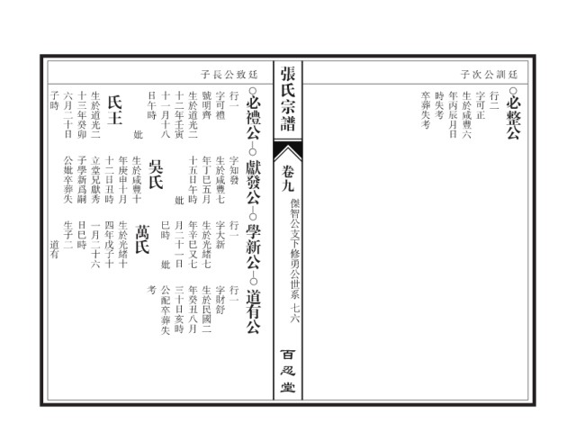 子時 六月二十日 十三年癸卯 生於道光二 氏王 日午時 十一月十八 十二年壬寅 生於道光二 號明齊 字可禮 行一 必禮公 卒葬失考 時失考 年丙辰月日 生於咸豐六 字可正 行二 必整公