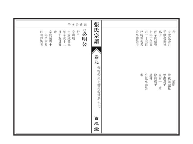 张氏宗谱 子次公致廷 日時葬失考 一年辛酉月 卒於咸豐十 時 月十五日丑 年辛亥十二 生於咸豐元 字可明 行二 必明公 公卒葬失考 巳時葬失考 月二十三日 七年丁巳五 氏卒於咸豐 爲子 子獻發兼祧 立堂兄必月 考 卷九 傑智公支下修勇公世系 考 公妣卒葬失 道林 徐賢成子 生女一 學俊爲子 承祧與胞兄 道朋 適 七七 百忍堂