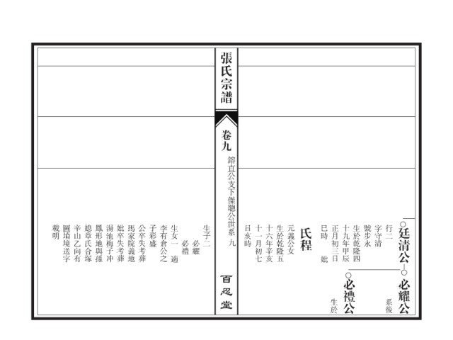 张氏宗谱 卷九 鎔直公支下傑聰公世系 載明 圖墳境送字 辛山乙向有 媳章氏合塚 鳳形地與孫 湯池梅子冲 妣卒失考葬 馬家院義地 公卒失考葬 子彩盛 李有倉公之 生女一 生子二 日亥時 十一月初七 十六年辛亥 生於乾隆五 元義公女 氏程 巳時 正月初三日 十九年甲辰 生於乾隆四 號步永 字守清 行二 廷清公 必耀 必禮 九 適 妣 百忍堂 必禮公 必耀公 生於 系後