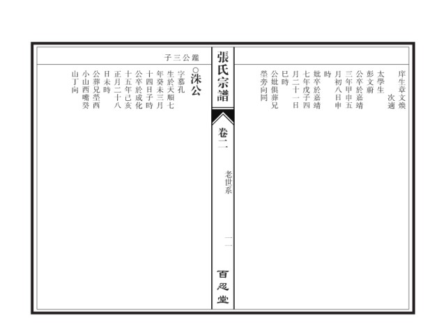 张氏宗谱 子三公鑑 山丁向 小山西嘴癸 公葬兄塋西 日未時 正月二十八 十五年己亥 公卒於成化 十四日子時 年癸未三月 生於天順七 字慕孔 洙公 塋旁向同 公妣俱葬兄 巳時 月二十一日 七年戊子四 妣卒於嘉靖 時 月初八日申 三年甲申五 公卒於嘉靖 彭文蔚 太學生 庠生章文煥 次 適 卷二 老世系 一一 百忍堂