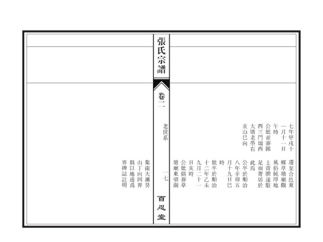 张氏宗谱 卷二 老世系 亥山巳向 大墩老塋右 西三門壋西 公妣並葬縣 午時 一月十一日 七年甲戌十 界碑誌註明 俱以地邊爲 山丁向四界 集南大灘癸 塘廟東望湖 公妣俱葬草 日亥時 九月二十一 十二年乙未 妣卒於順治 時 月十九日巳 八年辛卯五 公卒於順治 此焉 足而寄居於 土膏腴遂駐 風俗純厚地 鄉草塘廟觀 遷至合邑東 一七 百忍堂